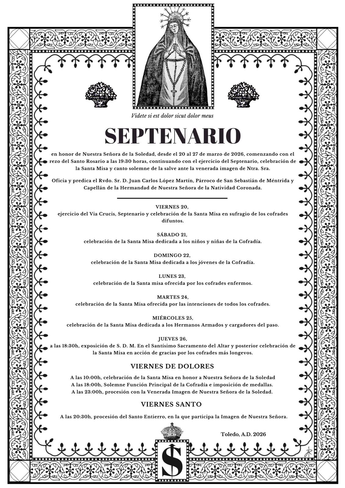 El Viernes de Dolores, 27 de marzo de 2026, la Cofradía celebrará una de las jornadas más señaladas en honor a Nuestra Señora de la Soledad. A las 10:00 horas tendrá lugar la Santa Misa en honor a la Santísima Virgen. Ya por la tarde, a las 18:00 horas, se celebrará la Solemne Función Principal […]