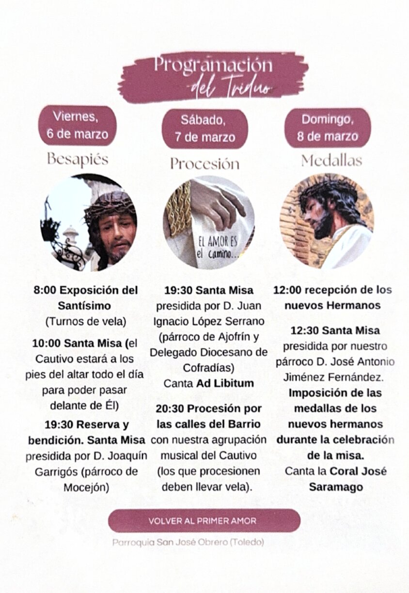 El segundo día del Triduo tendrá como acto central la salida procesional del Señor por las calles del barrio. Programa: 19:30 h. Santa Misa presidida por D. Juan Ignacio López Serrano, párroco de Ajofrín y Delegado Diocesano de Cofradías. Intervención musical de Ad Libitum. 20:30 h. Procesión por las calles del barrio acompañada por la […]