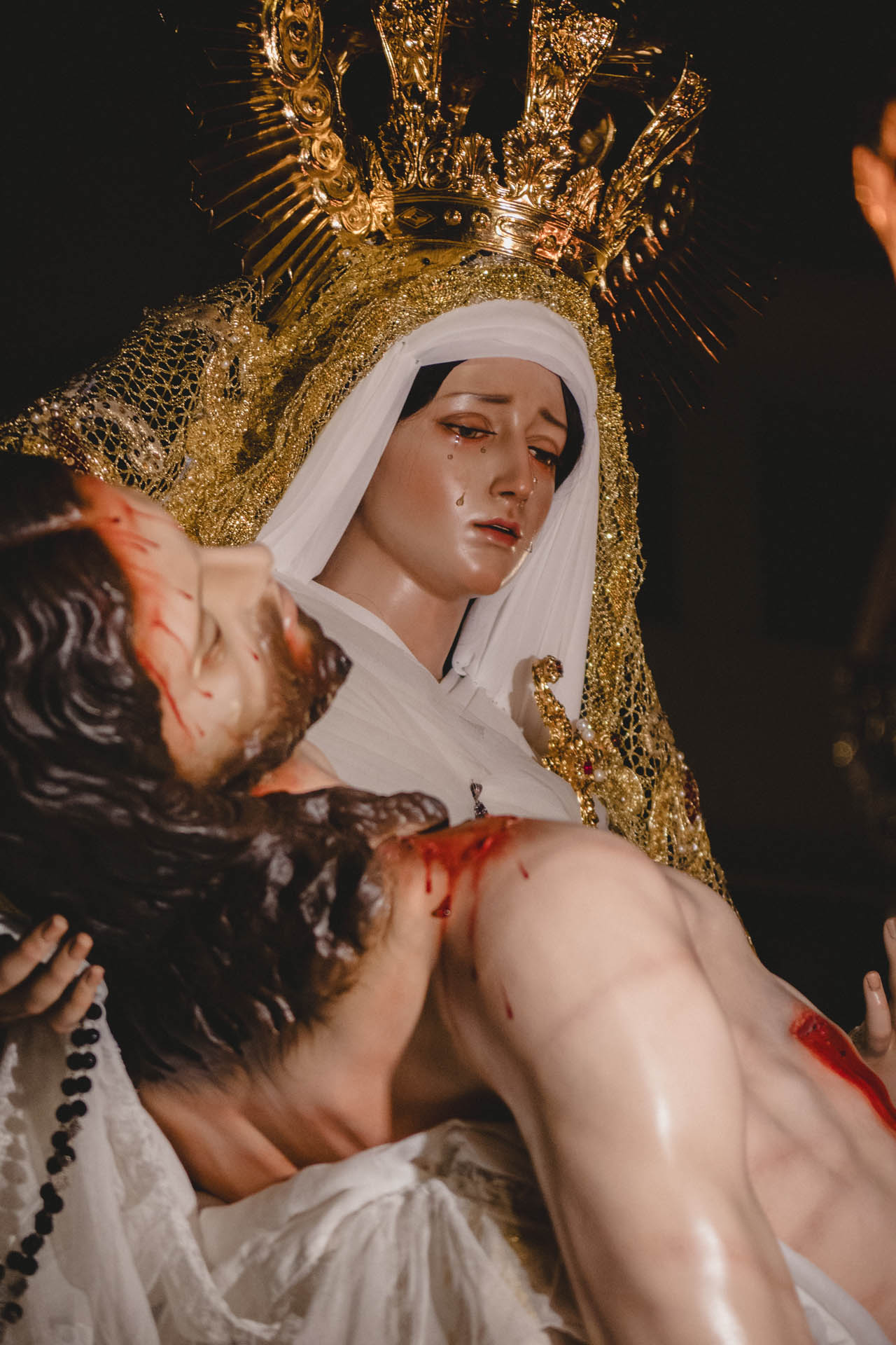 El paso representa la escena de la Piedad. La Virgen sostiene en su regazo el cuerpo sin vida de su Hijo, componiendo una imagen de intenso recogimiento y dolor contenido.