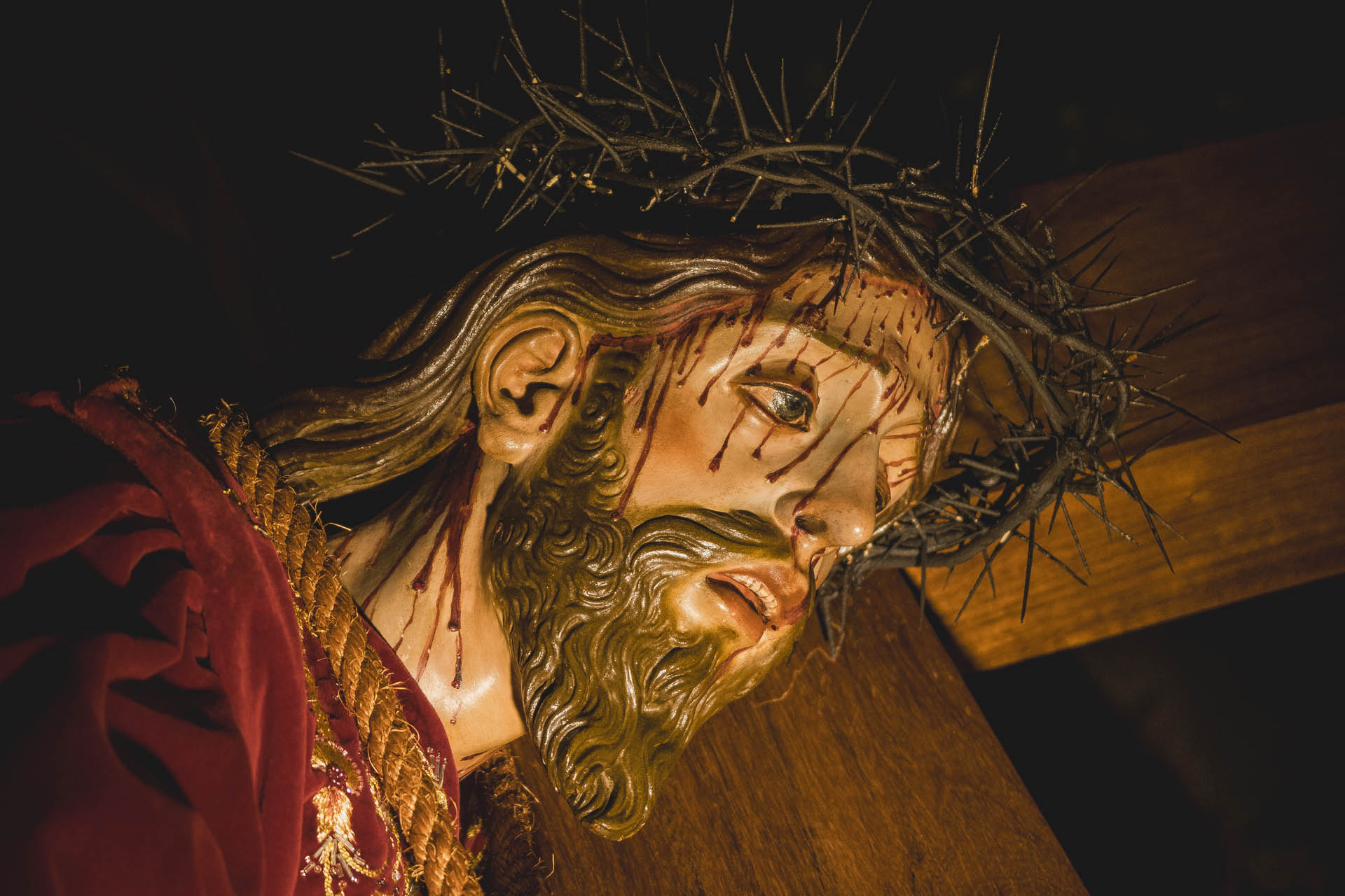 La policromía subraya el dramatismo del momento: sudor y sangre recorren el semblante, aunque la mirada —luminosa y resignada— expresa aceptación redentora. Es una imagen que conjuga dolor físico y grandeza espiritual.
