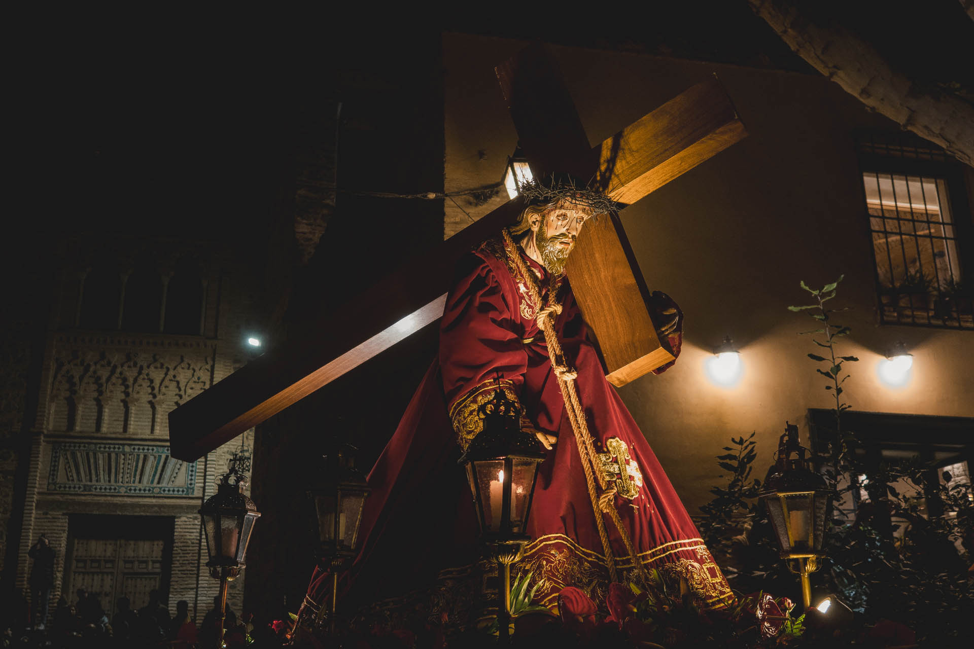 El Vía Crucis nocturno del Redentor es una de las expresiones más litúrgicas y recogidas del Miércoles Santo toledano. La combinación de canto gregoriano, campana conventual y tambor austero convierte esta procesión en una experiencia profundamente espiritual.