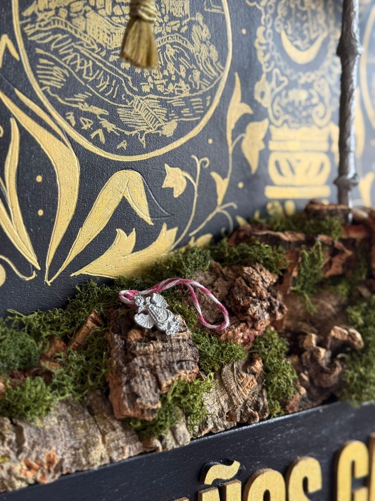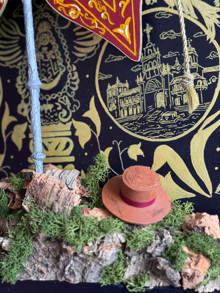 Lejos de ser una imagen plana, el cartel se convierte en una obra en tres dimensiones, incorporando elementos volumétricos que aportan profundidad real y convierten la pieza en algo casi procesional, más cercano a un altar o un retablo que a un simple soporte gráfico. El camino, los símbolos del peregrino y los detalles materiales refuerzan esa sensación de avanzar, de caminar juntos.