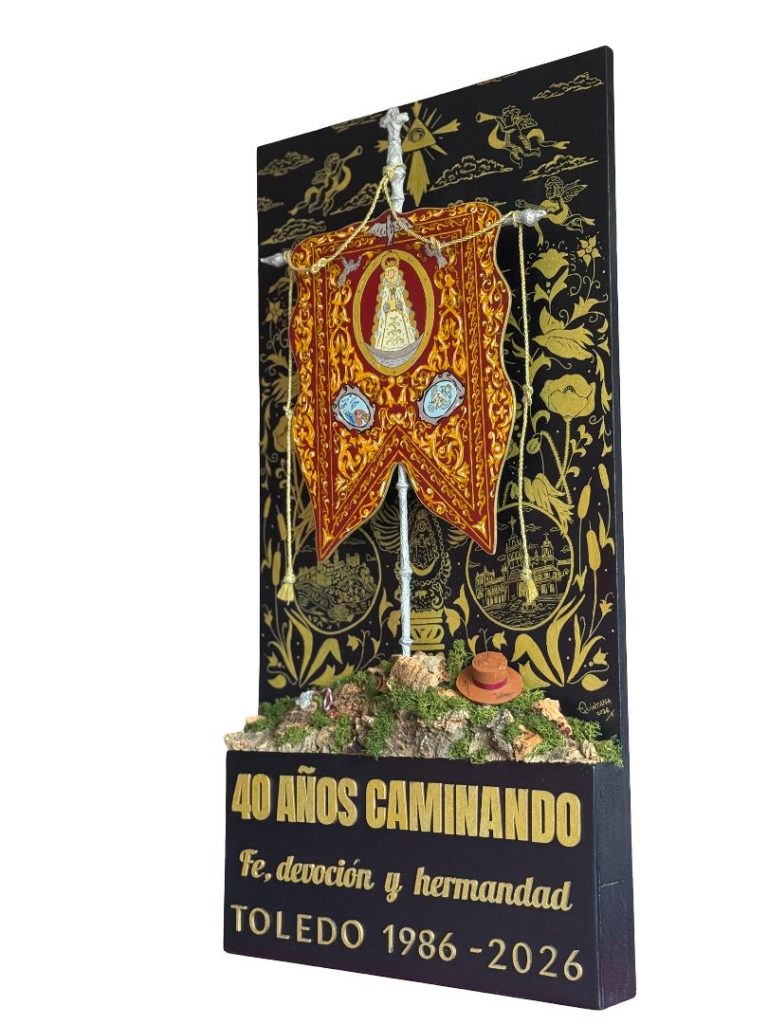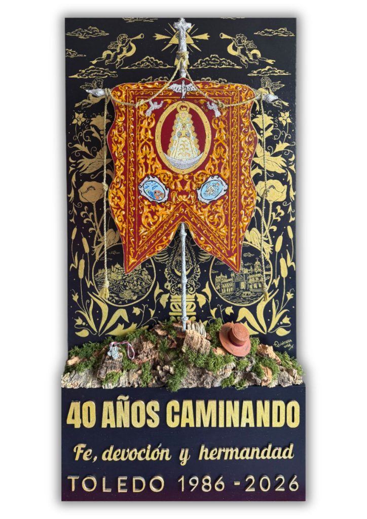 Presentado hoy en San Antonio, el cartel del 40 aniversario de la Hermandad del Rocío de Toledo es una obra de enorme fuerza estética y simbólica, a medio camino entre el cartel clásico y la obra escultórica. Firmado por Enrique Mateo Quintana (@quintana_arte), natural de La Roda de Andalucía y hermano de la corporación, el trabajo nace desde dentro, desde el conocimiento profundo de lo que significa caminar al Rocío desde Toledo.