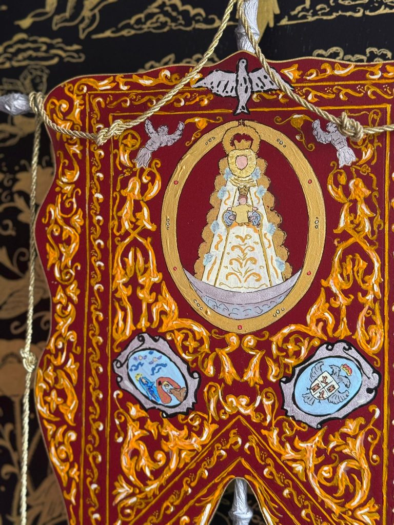El fondo damasquinado, riquísimo en oro sobre negro, envuelve toda la composición con un aire solemne y litúrgico, evocando tanto la tradición ornamental andaluza como el carácter intemporal de la devoción rociera. Sobre él se articula una estructura que remite claramente al simpecado, con la Virgen del Rocío presidiendo el conjunto como centro absoluto y razón de ser del camino.