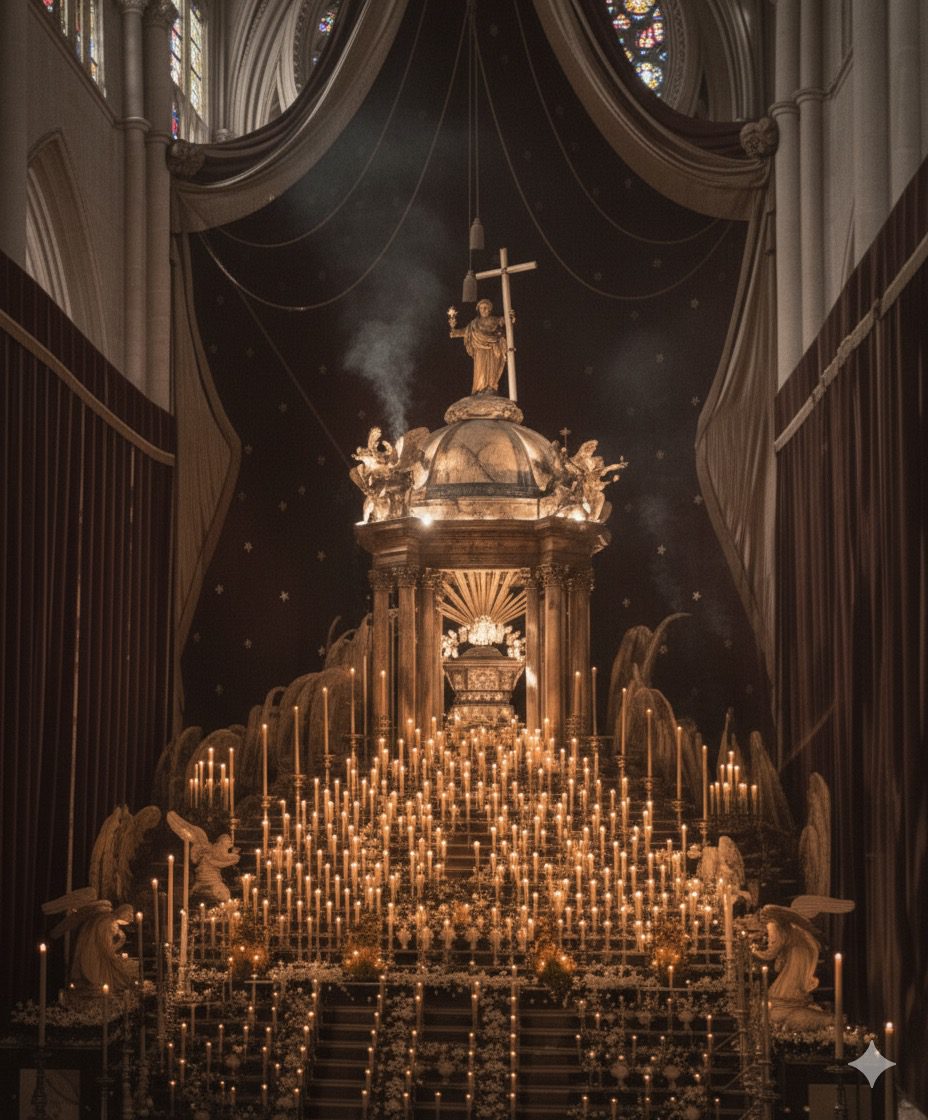 Aquel coloso efímero, levantado antaño en el trascoro, fue durante siglos una auténtica catedral dentro de la Catedral. Con sus más de treinta metros de altura, columnas, escalinatas, cortinajes y una cúpula que casi rozaba las bóvedas góticas, transformaba por completo el templo en los días santos, envolviendo al fiel en un ambiente de silencio, luz y misterio.
